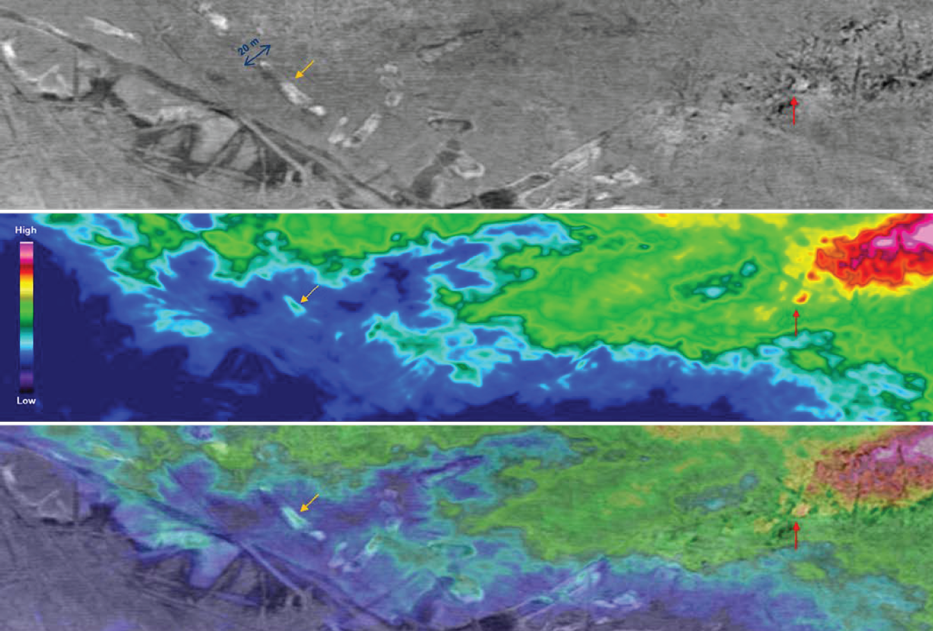 Depth slice through an UHR3D seismic image of the subsurface (top) together with (middle) an indication of soil property variation linked to stiffness (in this case seismic propagation velocity determined via an advanced imaging technique called Full Waveform Inversion) with a composite image of both (bottom)