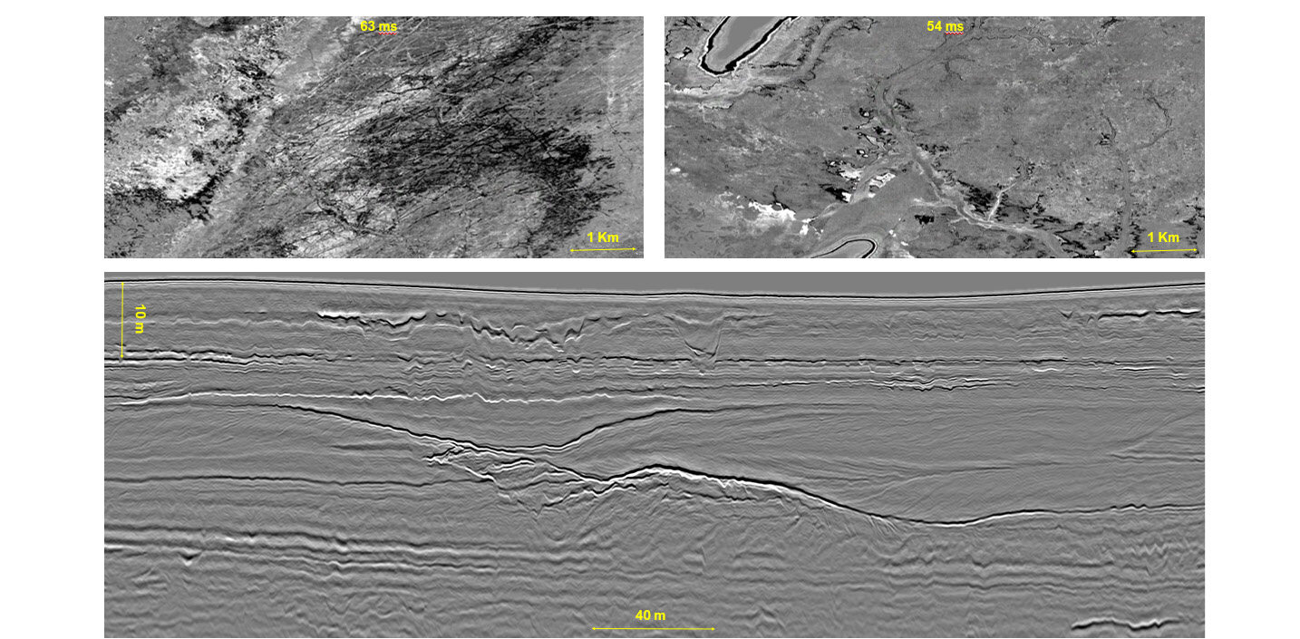 Figure 1. Three-dimensional migrated stack: two time slices on the top and a section at the bottom.