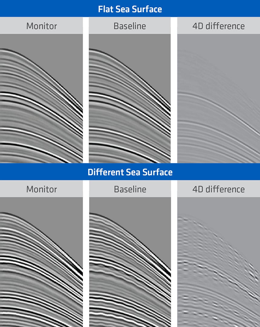 The level of 4D noise for a given combined source and receiver position error can then be reduced by limiting the exposure of the acquisition system to dynamic sea-state and environmental noise during survey acquisition, thereby improving 4D signal detectability. Deep towing of multisensor streamers enables the sea-state effects to be removed while maximizing signal bandwidth. Furthermore, variability in the emitted source wavefield is removed using calibrated shot-by-shot source signatures.