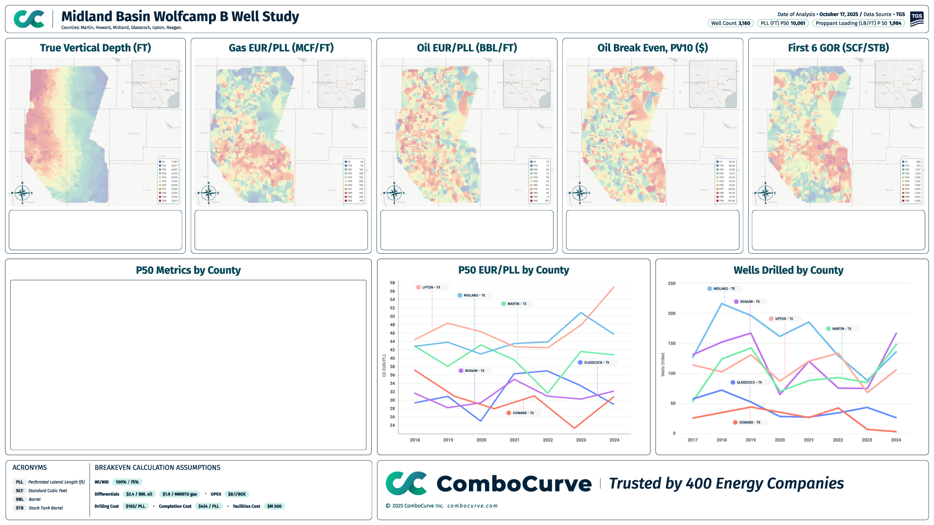 This Wolfcamp B study analyzes more than 3,100 wells across Martin, Howard, Midland, Glasscock, Upton, and Reagan counties using TGS data and ComboCurve’s forecasting and economic modeling. The results highlight strong well productivity with a P50 oil EUR of 40 bbl/ft and gas EUR of 268 mcf/ft, supported by average proppant loading of 1,984 lb/ft and lateral lengths around 10,000 feet. County-level P50 metrics show Midland, Martin, and Upton consistently delivering the strongest oil EURs and IRRs, while deeper or thinner reservoir sections in southern counties lead to higher breakevens and more variable returns. Trend charts indicate stable performance from 2018–2024 and shifting drilling activity among counties. Overall, the Wolfcamp B remains a competitive target within the Midland Basin, offering attractive economics in its core areas under the stated cost and price assumptions.