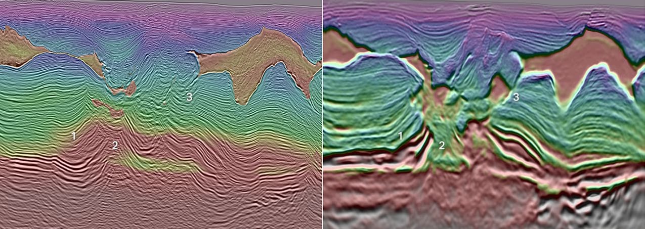 Early-Out 10 Hz E-DMFWI FDR (right) shows improved structural placement (1), better salt feeder definition (2), and salt-sediment interface (3), relative to the legacy WAZ streamer RTM (left).