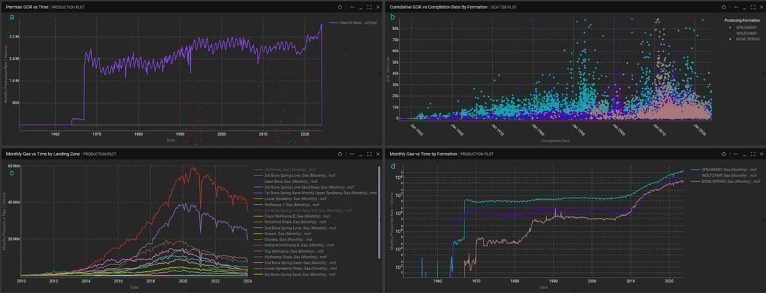 Figure 1: (a) Monthly GOR across all Permian Plays, (b) Cumulative well GOR by completion date, (c) Monthly Associated Gas Production by TGS Landing Zone, (d) Monthly Associated Gas by Reported Producing Formation